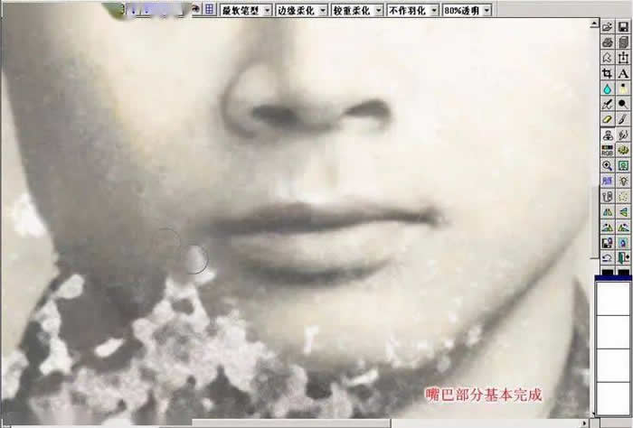 12.此图片最难处理的部分下巴,先将小的脏点漫漫处理掉再去处理比较大的脏块
